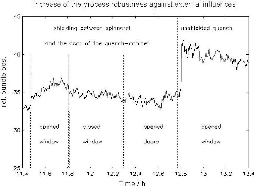 The figure (below) shows an example of the observation and evaluation of a change on the spinning machine with the help of this sensor: it could be observed directly that the influence of air pressure fluctuations on the process by opening and closing an approx. 5 m distant window or door, could be significantly reduced. After much more lengthy trials, the improvement could also be documented using the fluff rate.