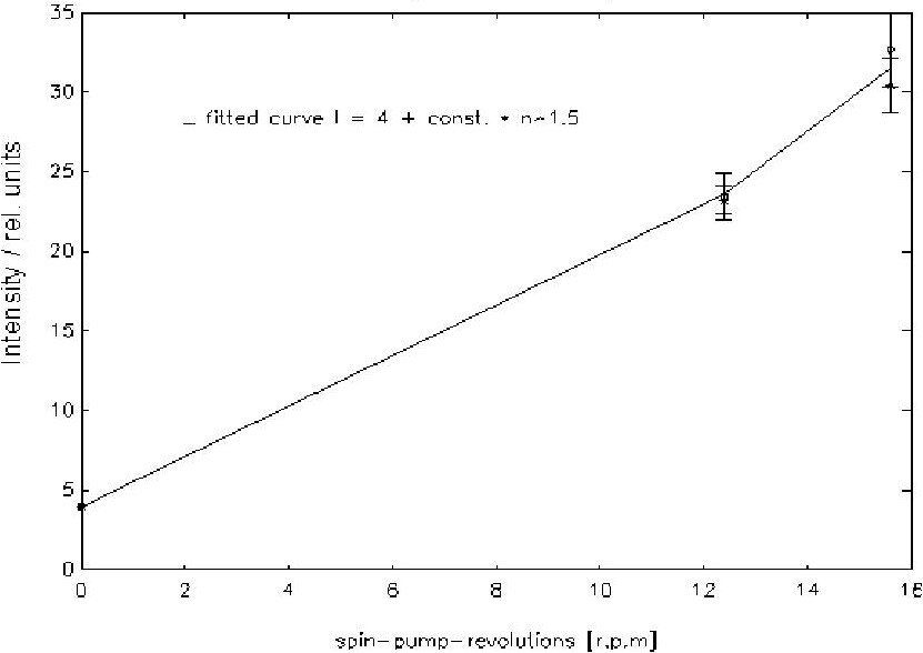 In addition to the deflection of the fibers in the direction of the air blow, the intensity of the light scattered on the fibers can be measured with this sensor. In the 180° arrangement, this is proportional to the mean value of the 3rd power of the fiber radii. With a constant density of the fibers, the intensity is therefore proportional to the 1.5th power of the throughput of the spinning pump. This relationship can be checked online, for example, in a gravitational spinning experiment (see figure below). With a constant density of the material (or a constant ratio of the amorphous to the crystalline parts) and constant pigmentation, the measured scattering intensity is proportional to the mean value of the 1.5th power of the titer of the individual filaments.